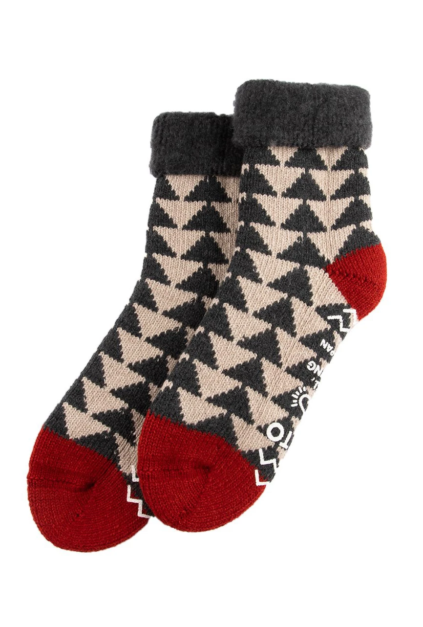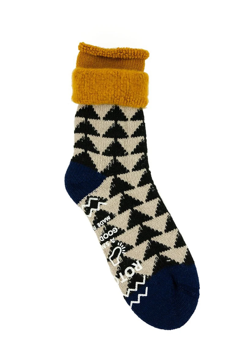 These room socks are made on a vintage machine that was originally designed for the production of socks for fishermen. Made using a bulky yarn blend of acrylic and wool. Brush finished on the inside for additional comfort. The sole features rubber grips making them an ideal indoor slipper sock.