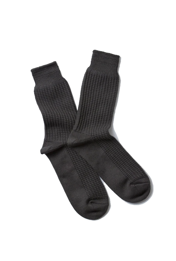Against the current trend of time-efficient manufacturing, these cotton waffle socks are intentionally knitted with an old-school knitting machine that is not computerized. The cotton-based surface is made with an inspiration from traditional thick waffle fabric, while the fabric used on the sole is smooth and plain for comfort. With just-right thickness, the socks can be worn with any types of shoes throughout the year