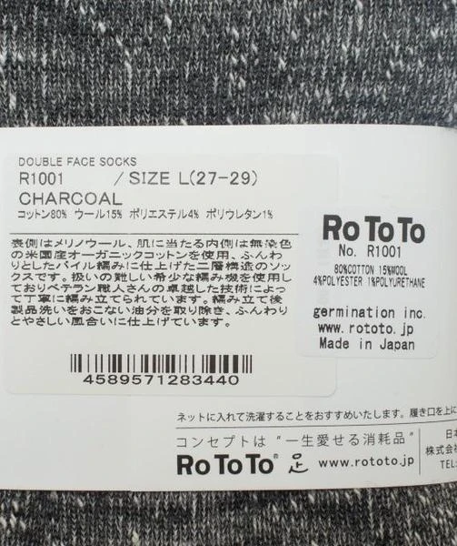 DOUBLE FACE SOCKS ROTOTO Knitted carefully by Japanese Shokunin artisans with merino wool and American organic cotton, this Double Face Socks of ROTOTO is comfortably super-soft and thick. Outside : american organic cotton Inside : merino wool Made in Nara, Japan M : 25 – 27 cm L : 27 – 29 cm
