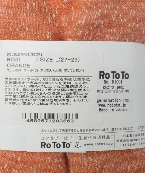 DOUBLE FACE SOCKS ROTOTO Knitted carefully by Japanese Shokunin artisans with merino wool and American organic cotton, this Double Face Socks of ROTOTO is comfortably super-soft and thick. Outside : american organic cotton Inside : merino wool Made in Nara, Japan M : 25 – 27 cm L : 27 – 29 cm