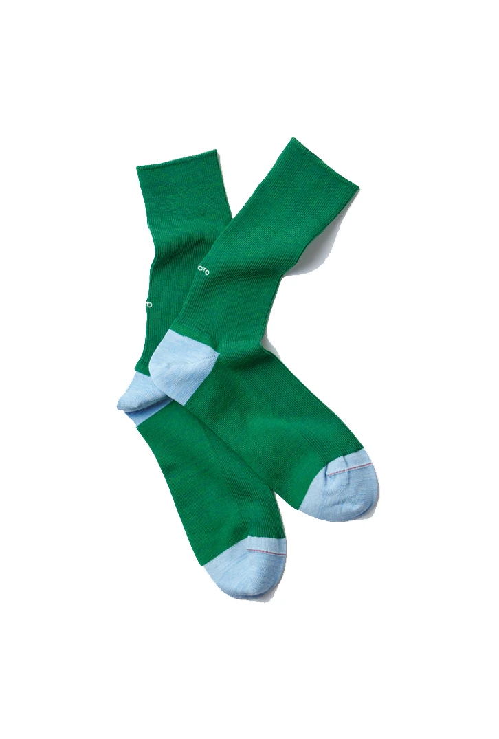 These socks are knitted with a mix of organic cotton and plastic bottle recycled polyester yarns. The color difference between the cotton and polyester yarn creates the beautiful heather pattern. The fabric of these socks has both the comfortable feel of cotton and quick-drying, durable and lightweight properties of polyester. The toe is attached to the body with a linking method to make the inside seams flat and feel more comfortable