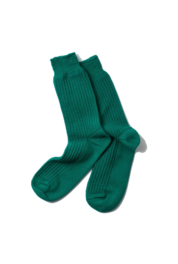 Against the current trend of time-efficient manufacturing, these cotton waffle socks are intentionally knitted with an old-school knitting machine that is not computerized. The cotton-based surface is made with an inspiration from traditional thick waffle fabric, while the fabric used on the sole is smooth and plain for comfort. With just-right thickness, the socks can be worn with any types of shoes throughout the year